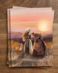 Enjoy this beautiful summer inspired postcard. The illustration portrays a young woman in a green dress enjoying a beautiful orange sky whilst enjoying the company of her sleeping fox friend, capturing a moment of summertime happiness.